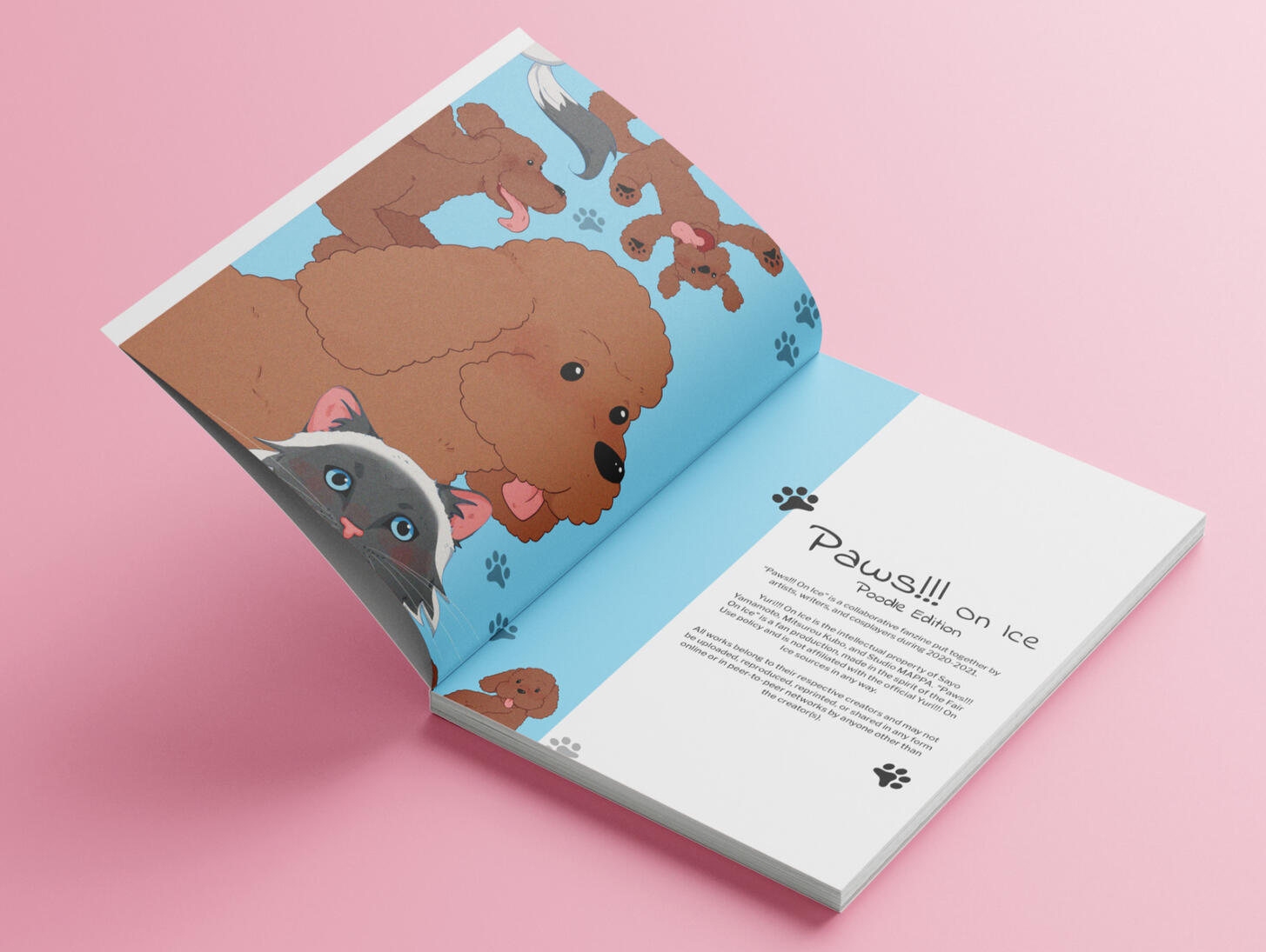 The Paws!!! on Ice zine is a Yuri!!! on Ice fanzine with 228 pages of art, fiction, and cosplay dedicated to Victuuri, Otayuri, and their pets!